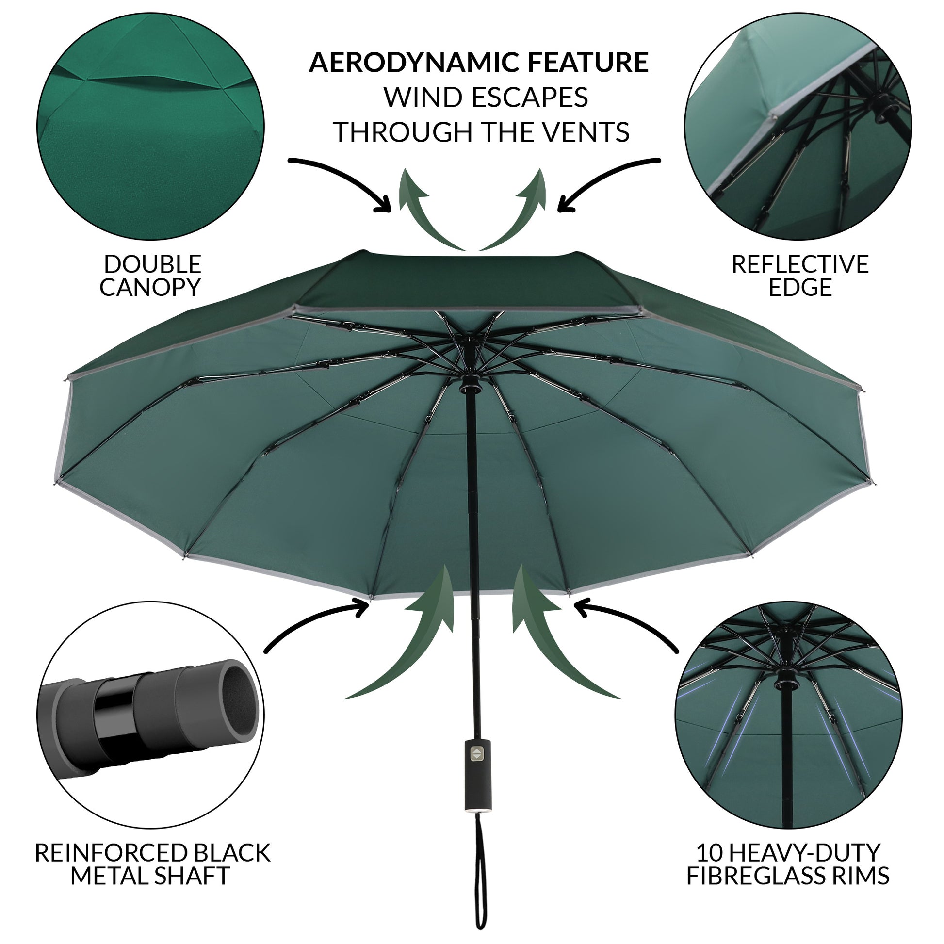 STRONG WIND RESISTANT UMBRELLA: Our umbrella is equipped with 10 robust Fiberglass ribs, engineered to withstand high winds without sustaining damage. The new flex-tech ribs provide extra reinforcement, preventing the umbrella from bending or breaking. This sturdy construction with a black metal shaft ensures the umbrella remains reliable and offers lasting protection in stormy weather.